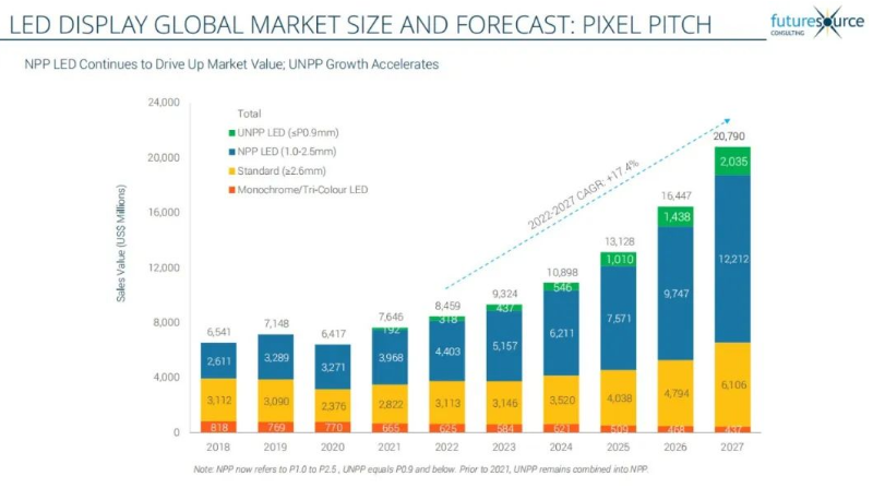 2022年,全球LED顯示行業(yè)展現(xiàn)出持續(xù)增長的強勁勢頭。Futuresource報告顯示,2022年全球LED顯示市場達到85億美元,與2021年相比增長了10.6%。Futuresource預(yù)計2023年全球LED市場的收入將增長10.2%,達到93億美元。五年預(yù)測顯示,到2027年,復(fù)合年增長率(CAGR)將達到17.4%,市場規(guī)模將增至208億美元。利亞德作為國家制造業(yè)單項冠軍,對顯示行業(yè)未來發(fā)展充滿信心。
